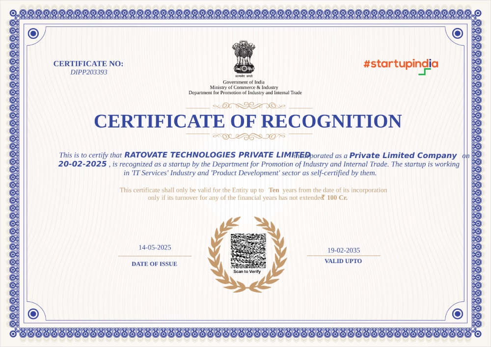 20-02-2025, is recognized as a startup by the Department for Promotion of Industry and Internal Trade. The startup is working in ‘IT Services’ Industry and ‘Product Development’ sector as self-certified by them.
